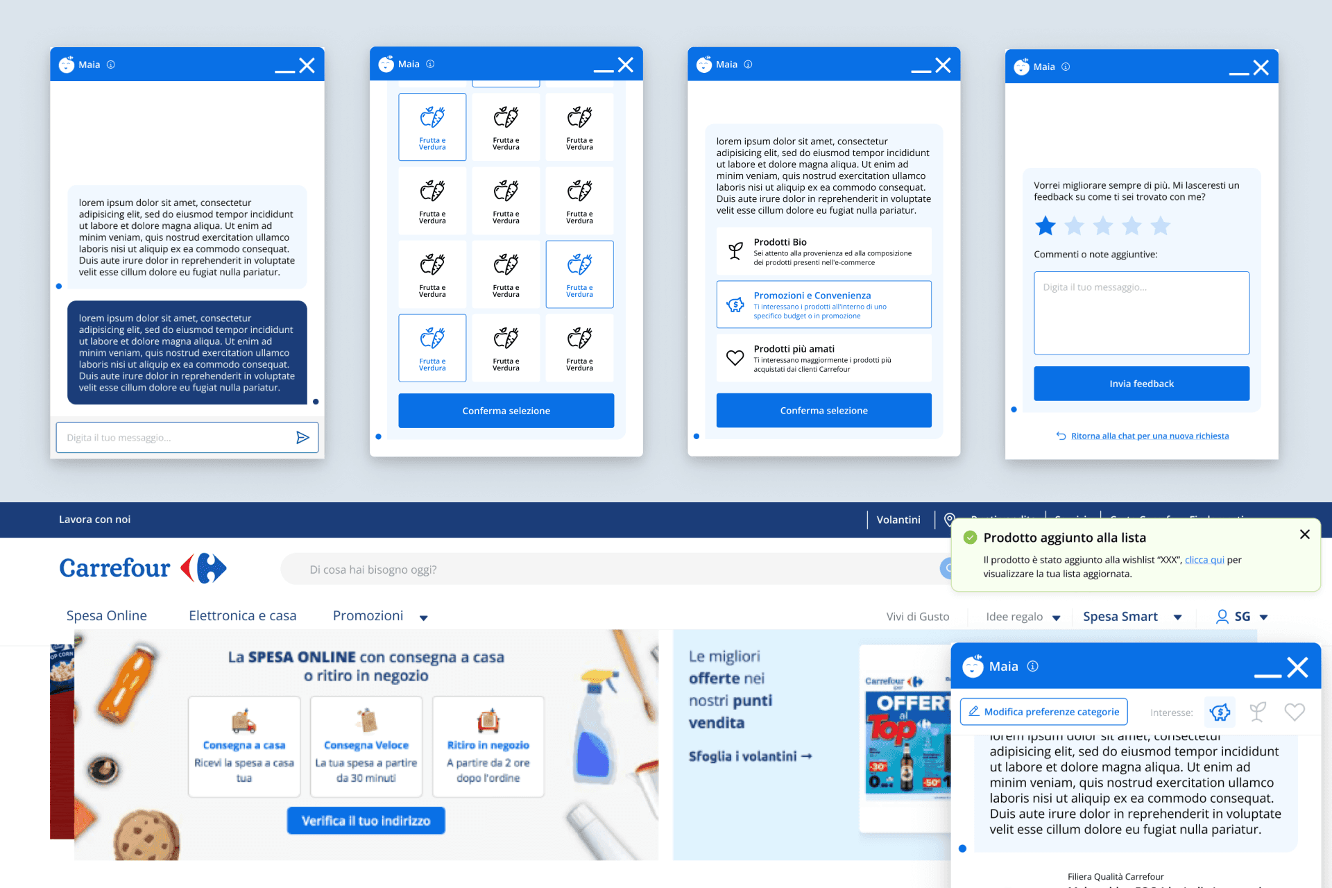 I led the design of the experience across multiple channels, starting from low-fidelity wireframes to high-definition mockups developed in Figma. User flows were mapped in Miro, and a modular, customizable UI was developed to support the integration of the assistant across web and mobile interfaces.